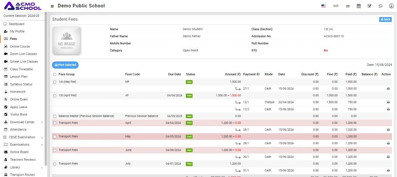 After login from student panel, go to sidebar menu click and follow Fees link. Here you can see fees details. If the online payment gateway is enabled from there, then the student can pay the fees from this side.