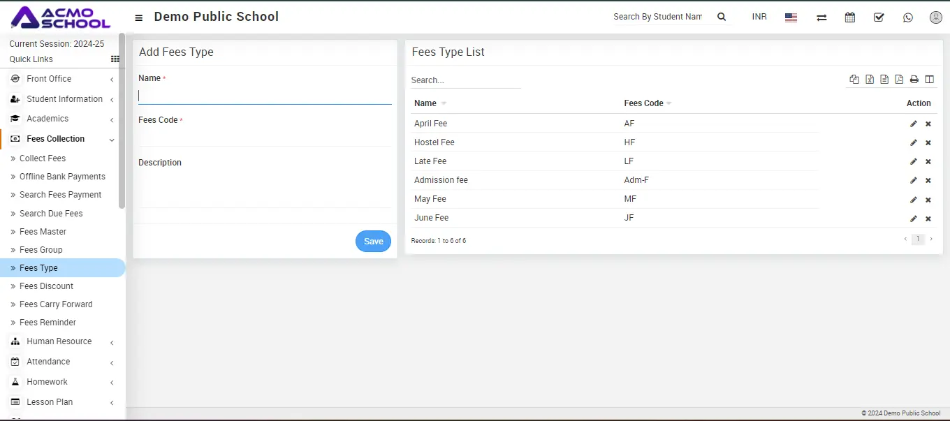 To add fees type, go to Fees Collection > Fees Type then enter Name, Fees Code and Description and then click on Save button. You can view this added record in the Fees Type List on right side of the page.