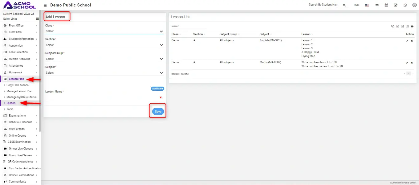 Here select Class, Section, Subject Group and Subject then enter Lesson Name, to add multiple Lesson click on Add More button then finally click on Save button.