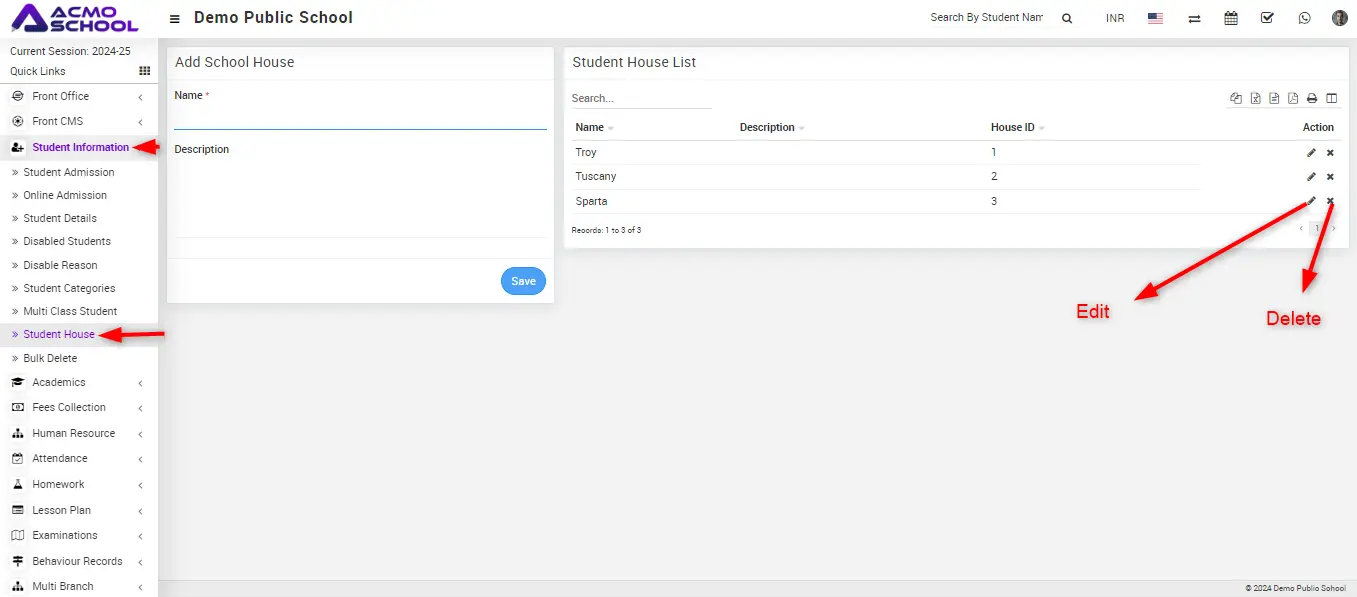 To edit student house click on Edit icon and to delete student house click on Delete icon present in the student house list.