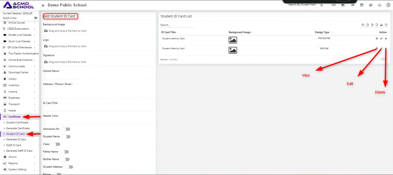 To edit/delete ID card click on Edit/Delete icon present in the student ID card list.