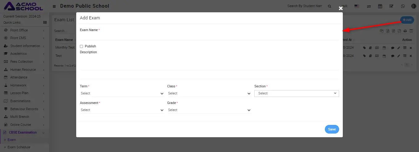 To Add Exam simply click on Add button present at the top right corner, Add Exam model will be open.