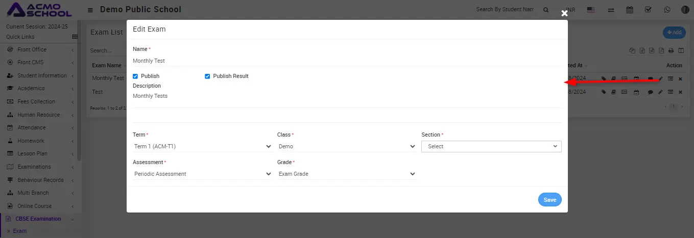 To edit the exam, simply click on the edit (pencil) icon showing at the action column, Edit Exam model will be open.