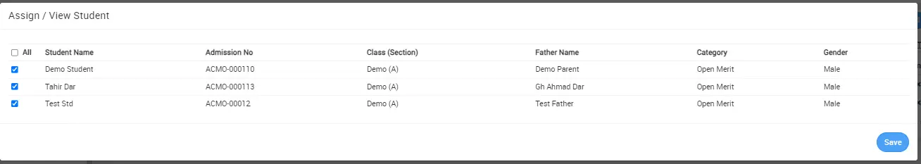 After making the necessary changes, click on the save button to successfully assign or unassigned the exam to the student.