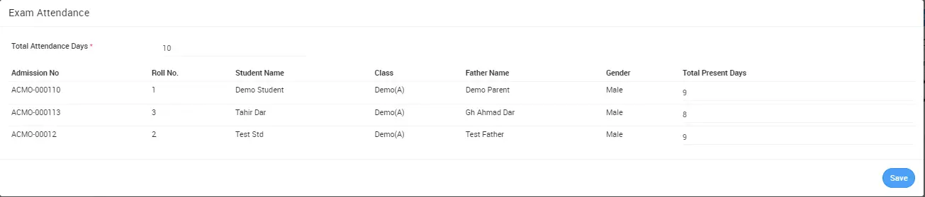 First set Total Attendance Days, then enter the number of days the student was present in school and click on the save button to mark their attendance successfully.