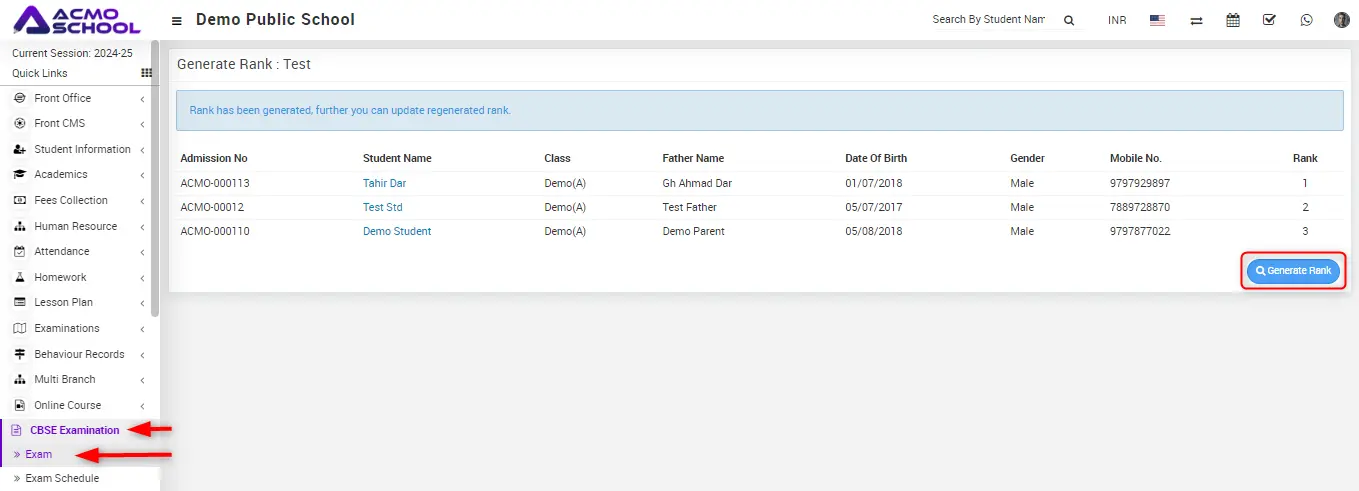 Note : – This rank will show as exam wise and you can also check this rank from the student side CBSE Examination > Exam Result.