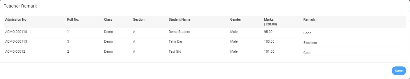 The teacher can give remarks to the students based on their performance in the exam and click on the save button and the remark for the student will be successfully saved.