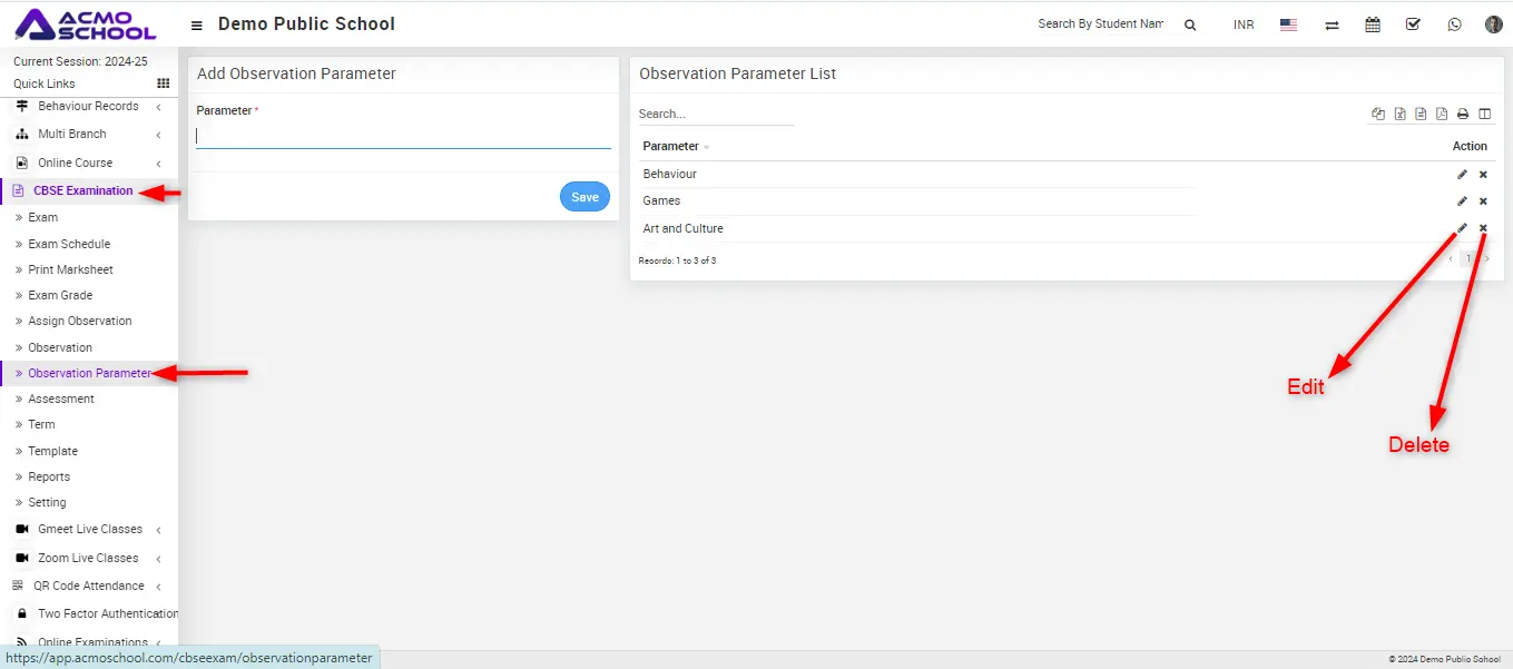 Go to CBSE Examination > Observation Parameter.