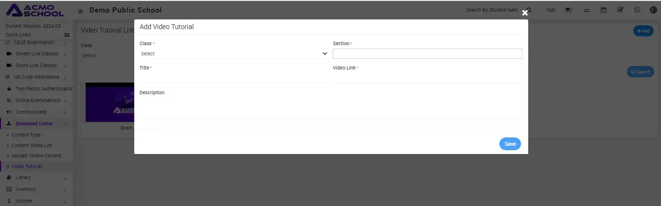Add Video Tutorial model will be open. Here select the Class, Section, enter Title of tutorial, Video Link (YouTube link) and Description about the tutorial, now click the Save button.