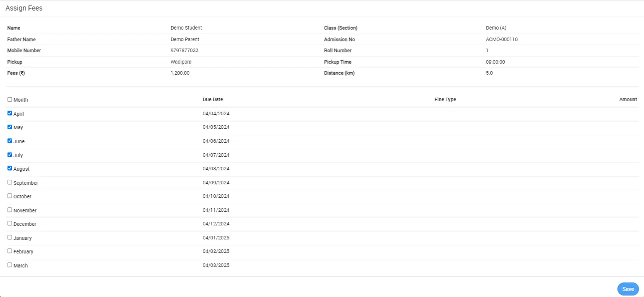 Then click the Save button to successfully assign the month’s transport fees to the student.