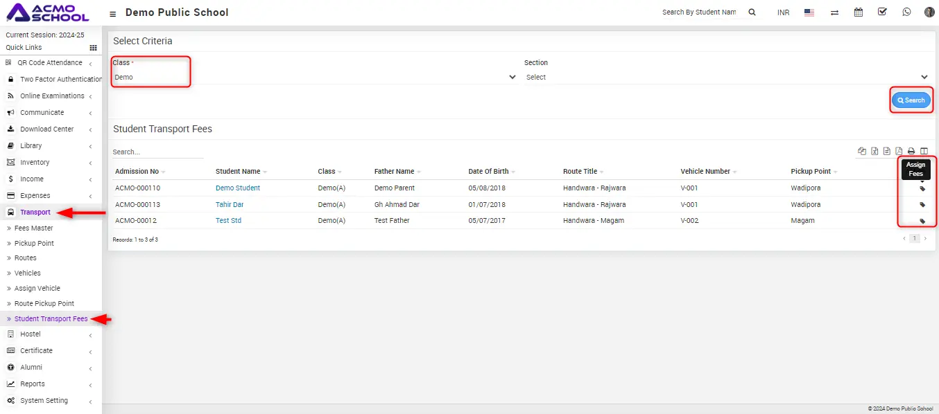 You can assign the transport fees to the student by clicking on the Assign Icon, which is shown in the Action column.