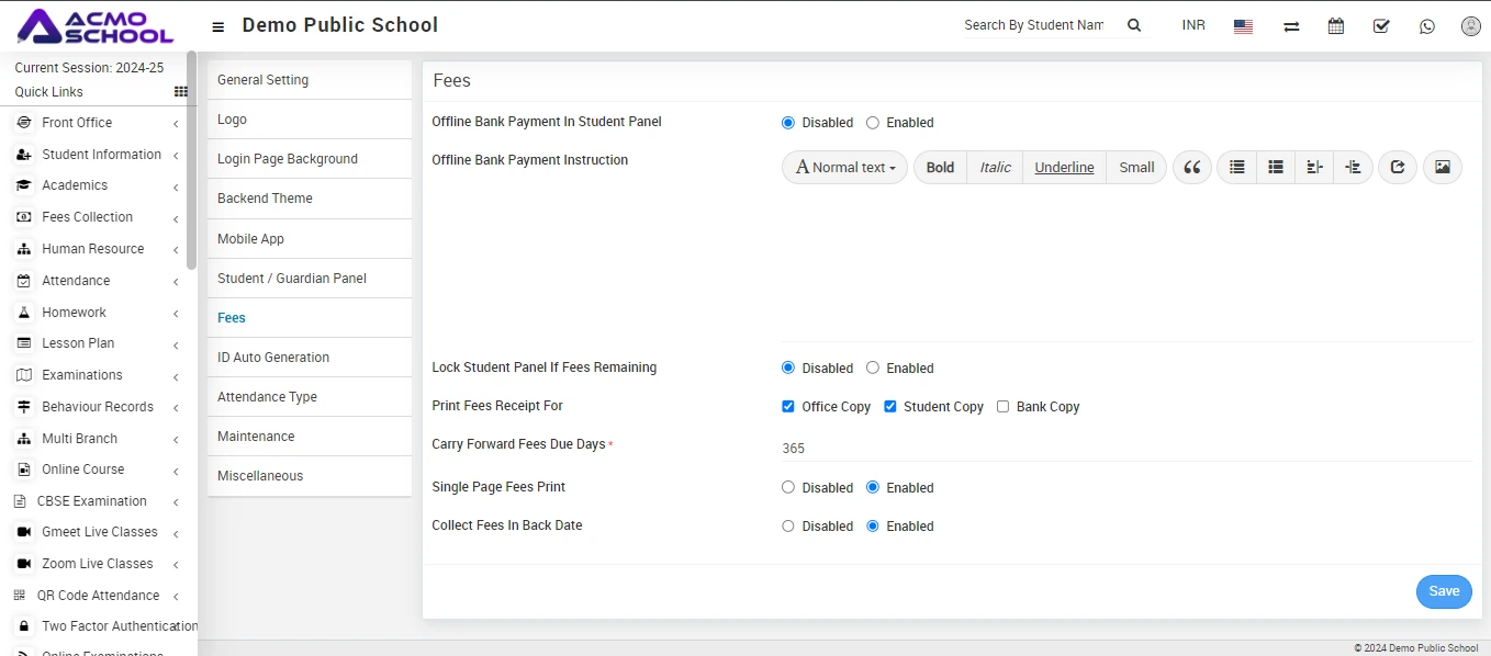 To set carry forward due date, go to System Settings > General Setting then go to Fees section and then enter Carry Forward Fees Due Days and then click on the Save button.