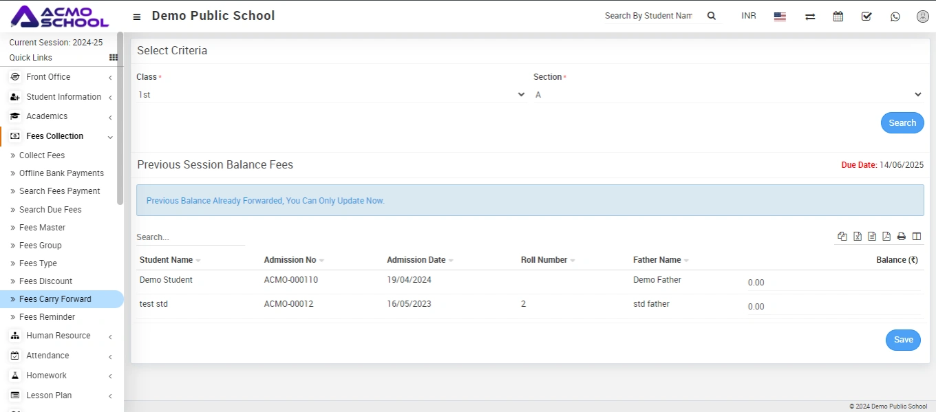 If a student has the remaining amount in the previous session, then you can forward this remaining amount in the next session.