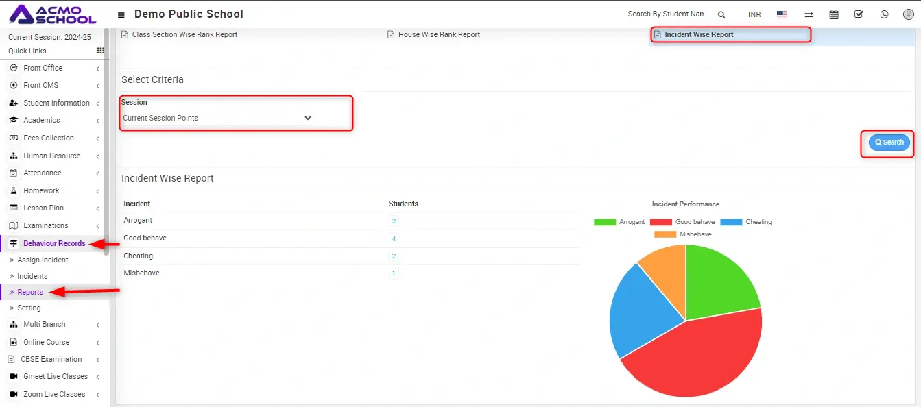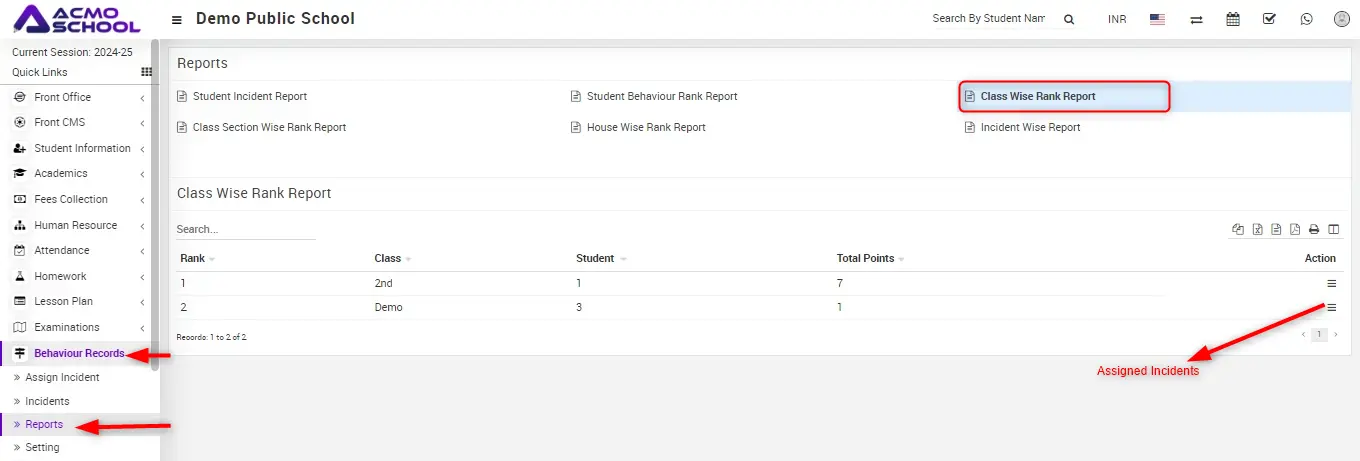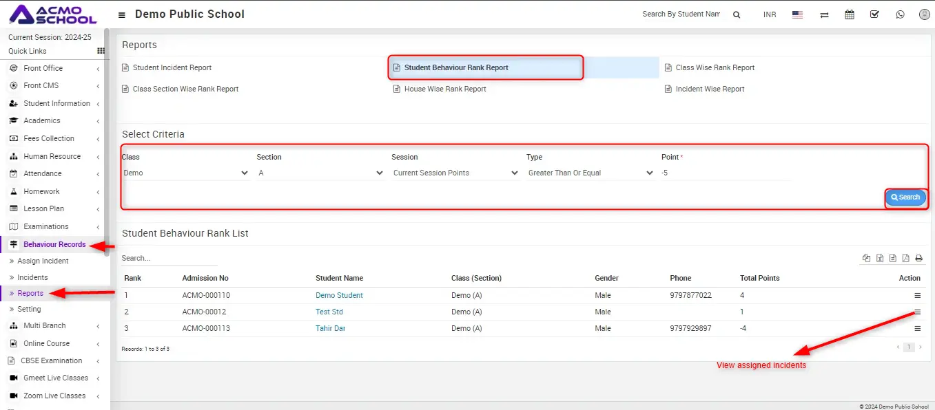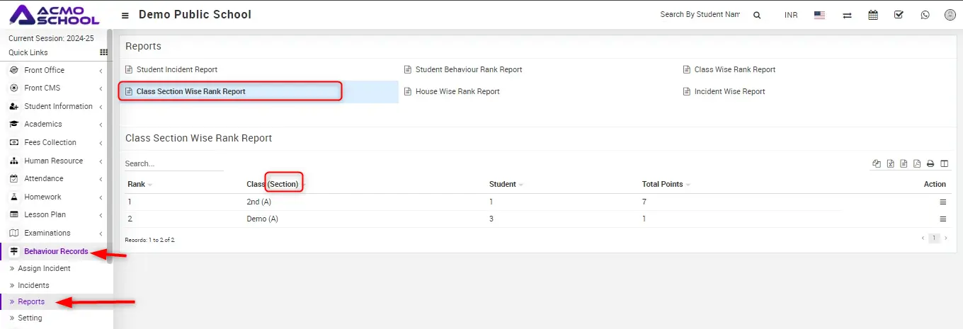 Click on student behaviour rank report, and at the bottom, select criteria then click on search the student behaviour rank list will appear at the bottom.