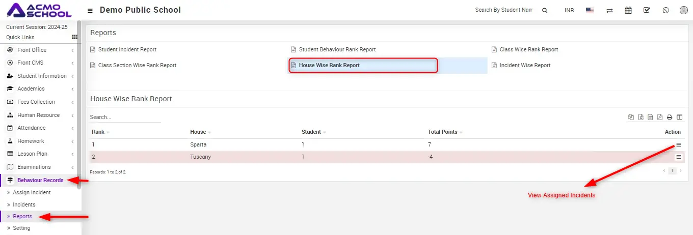 To check the House wise rank report, click on the house wise rank report, the list will appear at the bottom.