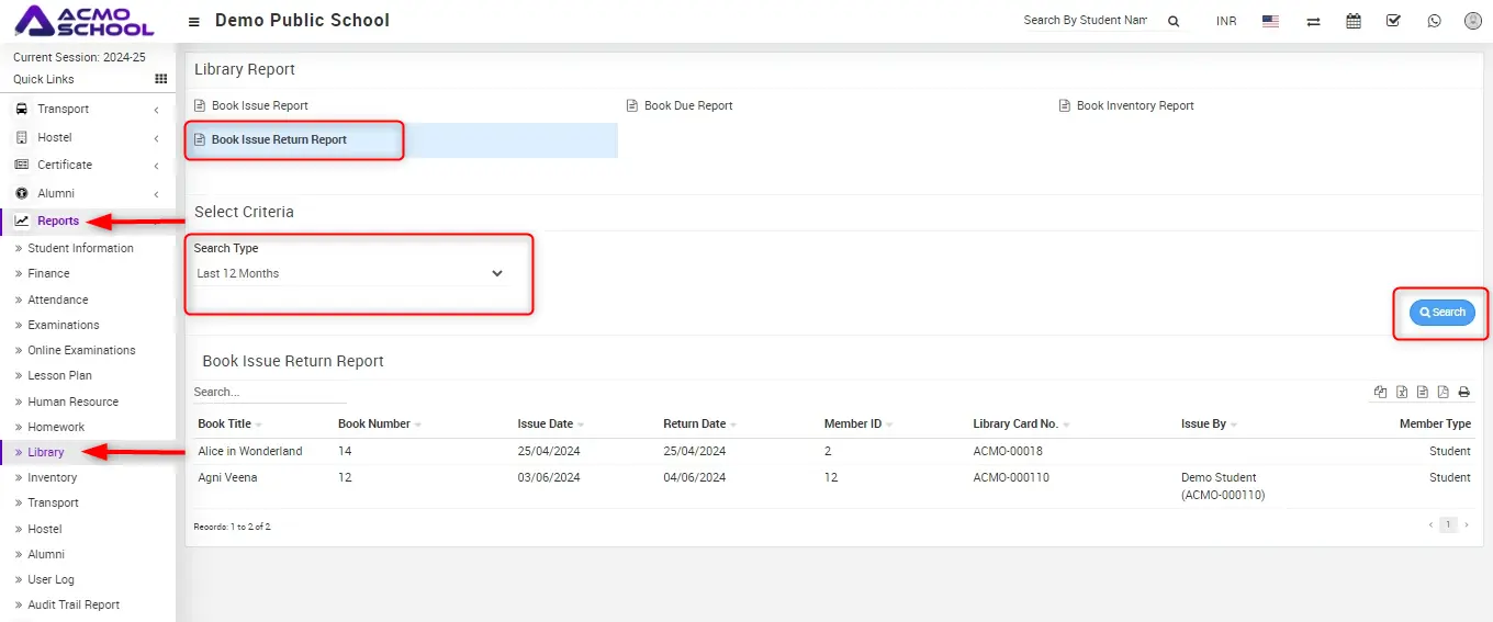 Go to Report > Library then click on Book Issue Return Report.