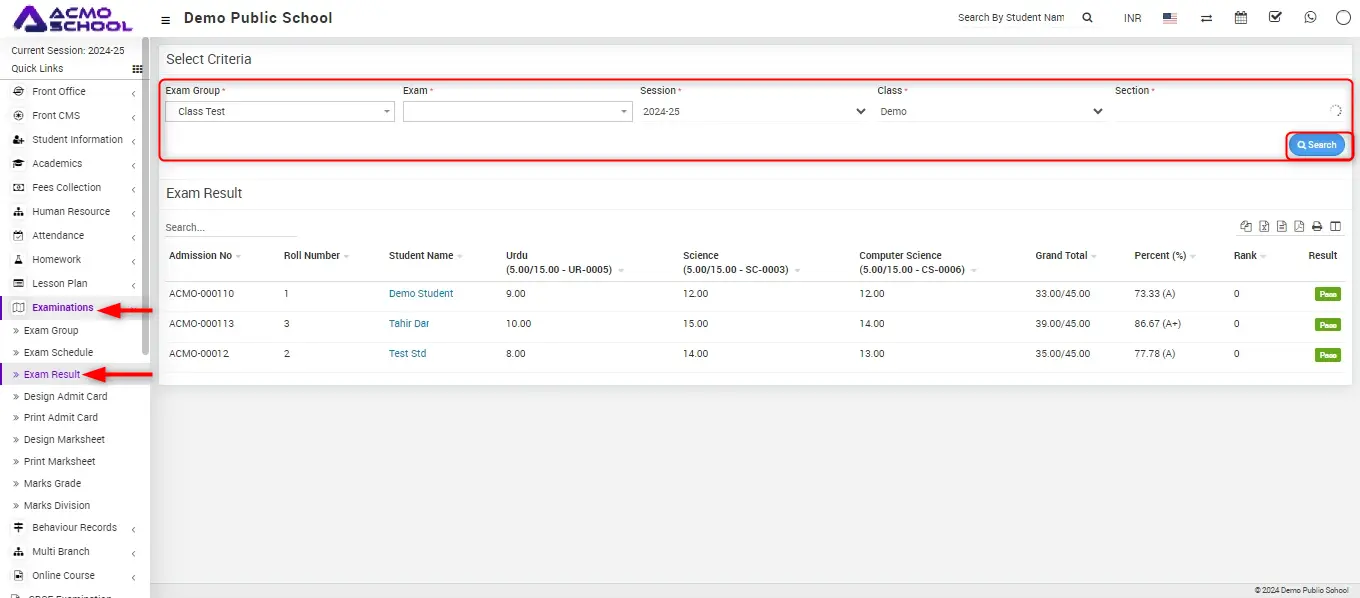 Go to Examination > Exam Result then select the Exam Group, Exam and Session, Class, Section and then click on the Search button.