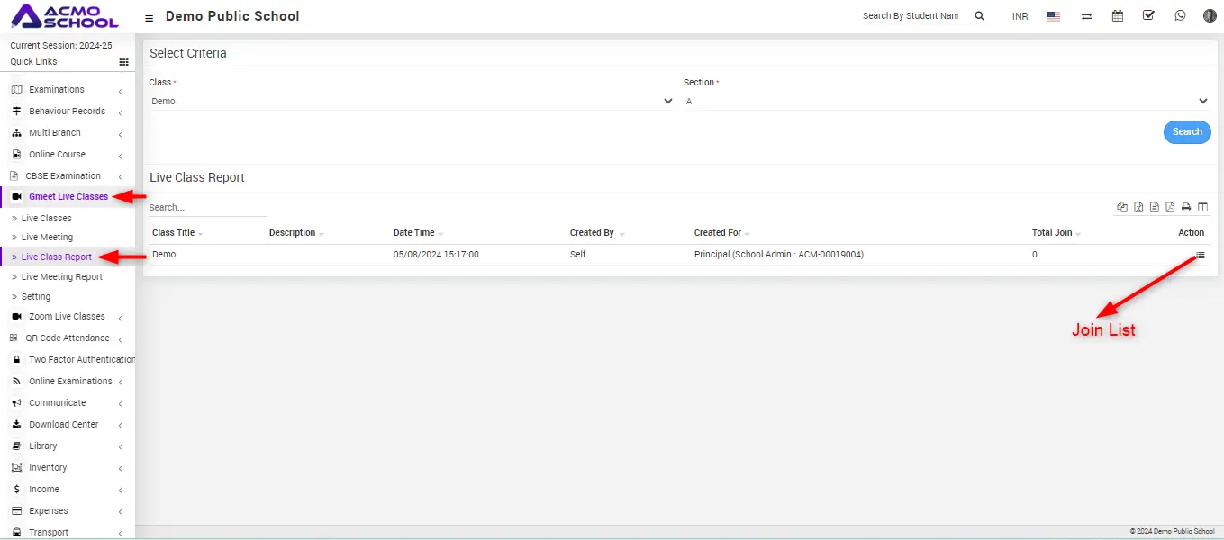 To check join student list in a Live Class Report, click on the View icon from Action column at click of this icon join list model will open.