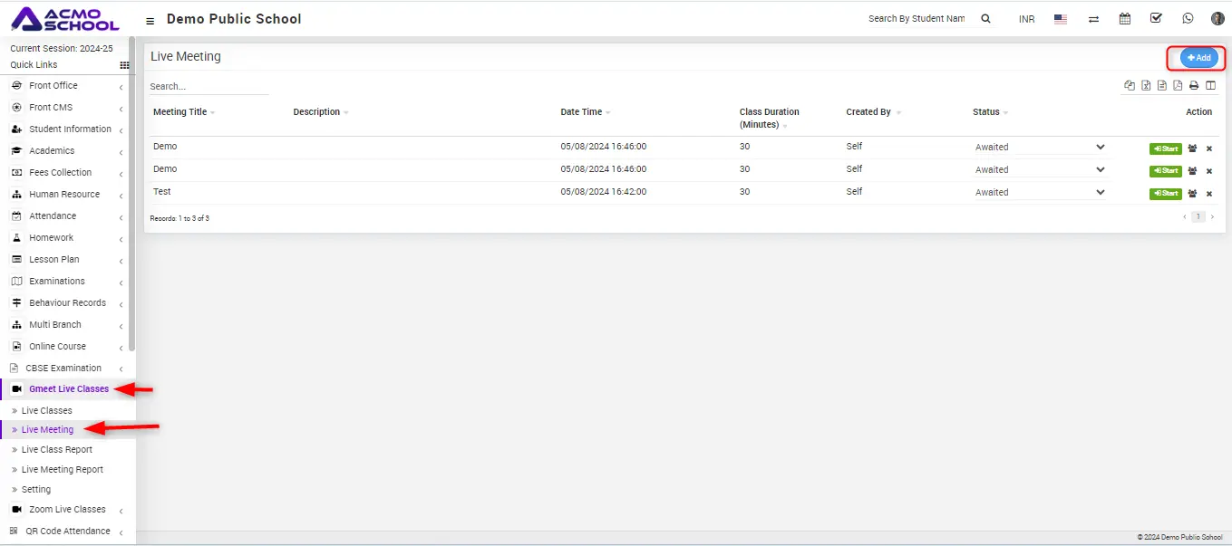 Here enter Meeting Title, Meeting Date, Meeting Duration, Gmeet URL, Description and select staff list and then click on Save button.