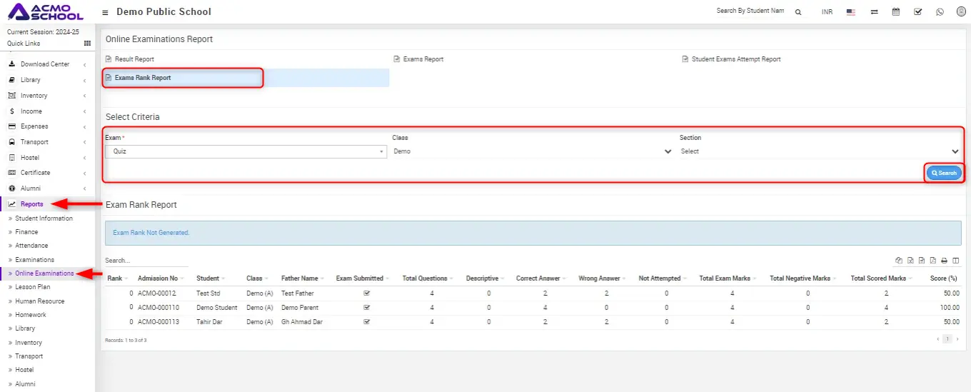 Go to Reports > Online Examinations click on Exams Rank Report.