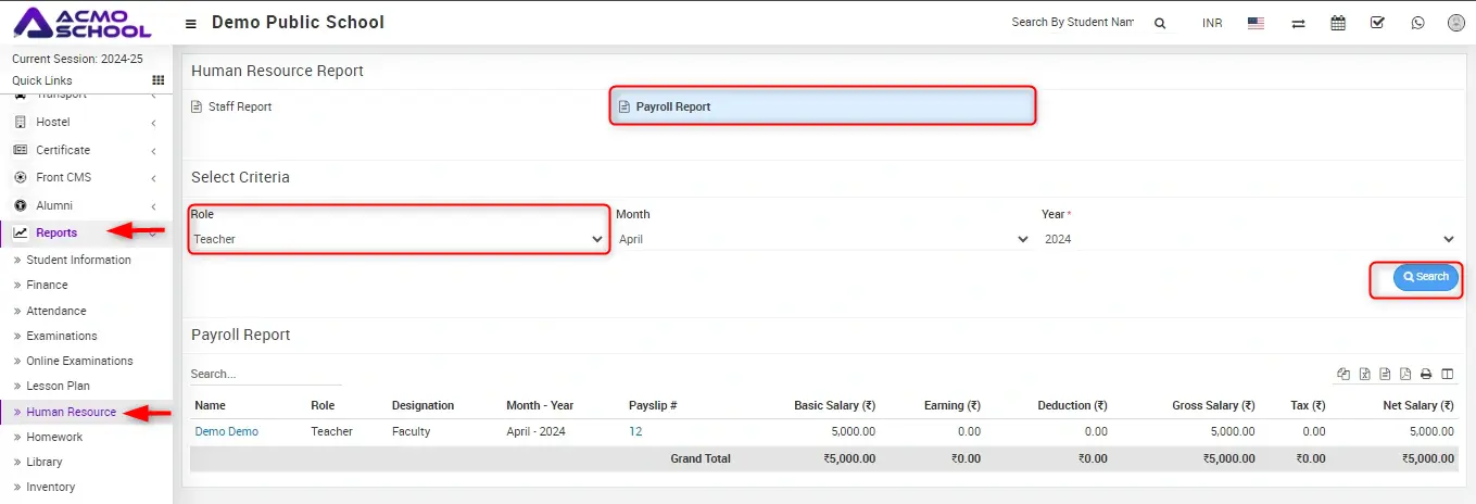 How to check Payroll Report? Go to Report > Human Resource then click on Payroll Report. Select Role, Month, Year and then click on Search button here you can see Payroll details. Updated on June 25, 2024 Tagged: AdminCheck Payroll ReportHR Management Was this article helpful? Yes No Related Articles How to view Disabled Staff? How to view Teachers rating? How to Approve Leave Requests? How to Apply for a Leave? How to generate Payroll for Staff members? How to mark Staff Attendance?