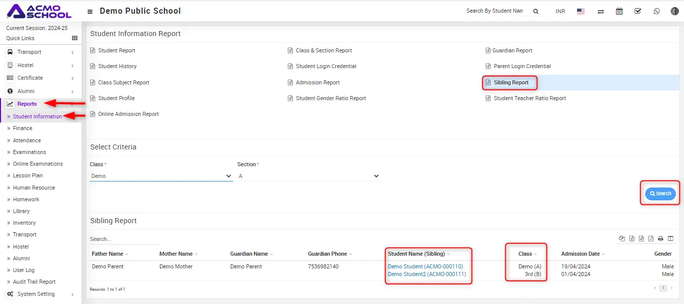 How to check Sibling report? Go to Reports > Student Information Report click on Sibling Report. Here select the Class and Section and then click on Search button here you can see sibling details. Updated on July 31, 2024 Tagged: AdminCheck Sibling Report Was this article helpful? Yes No Related Articles How to Check Student Teacher Ratio Report? How to Check Student Gender Ratio Report? How to check Student Profile report? How to check Admission Report? How to check Class Subject Report? How to check Student Login Credential report?