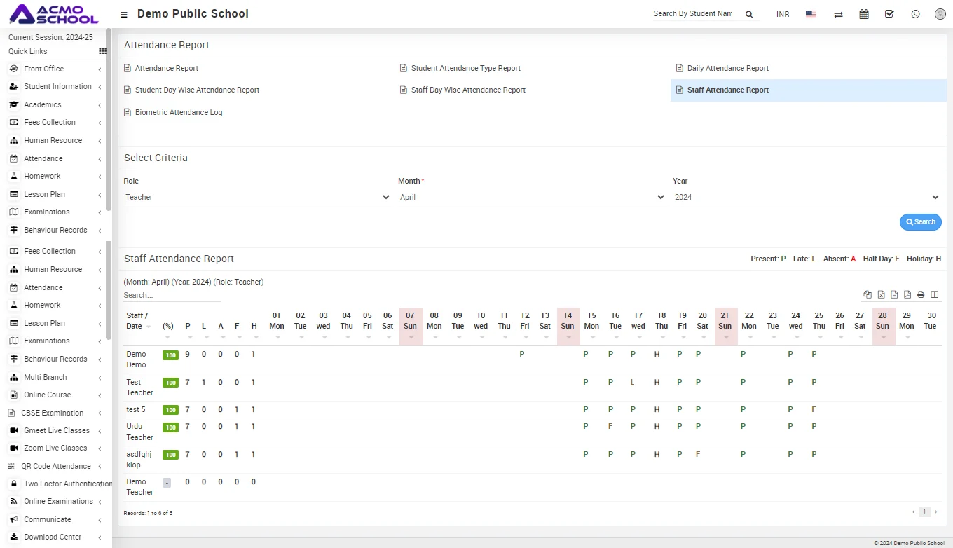 Select Role (role option like Admin, Teacher, and Accountant etc.), Month and Year and then click on Search button. The list of searched record will be shown in the below of the page.
