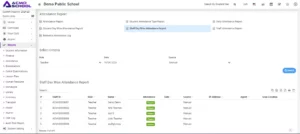 To check staff attendance report, go to Report > Attendance click on Staff Day Wise Attendance Report.
