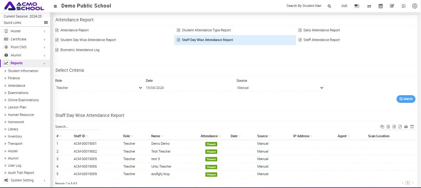 Select Role (role option like Admin, Teacher, and Accountant etc.), Date and Source and then click on Search button. The list of searched record will be shown in the below of the page.