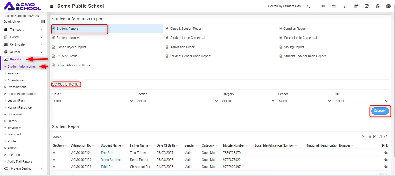 How to check Student Report? Go to Reports > Student Information Report click on Student Report. Here select the Criteria and then click on Search button. Updated on July 30, 2024 Tagged: AdminCheck Student Report Was this article helpful? Yes No Related Articles How to Check Student Teacher Ratio Report? How to Check Student Gender Ratio Report? How to check Student Profile report? How to check Sibling report? How to check Admission Report? How to check Class Subject Report?