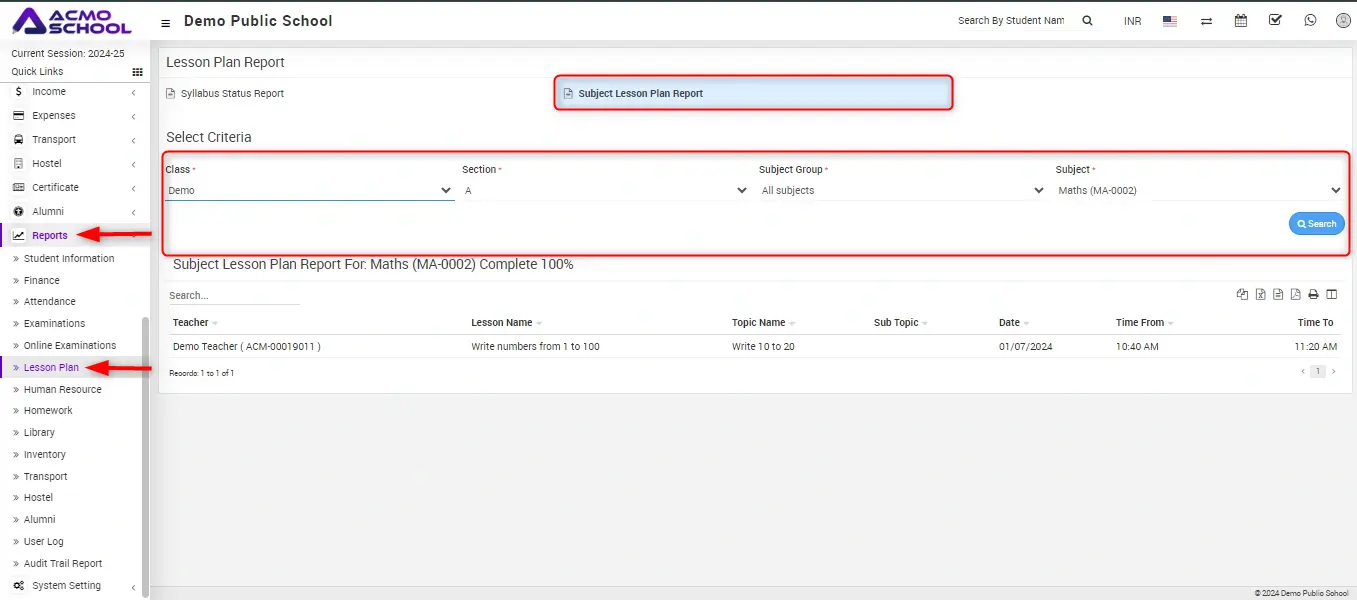 Then click on Subject Lesson Plan Report, select Class, Section, Subject Group and Subject then click on Search button. Here you can see all created Teacher wise Lesson Plan.