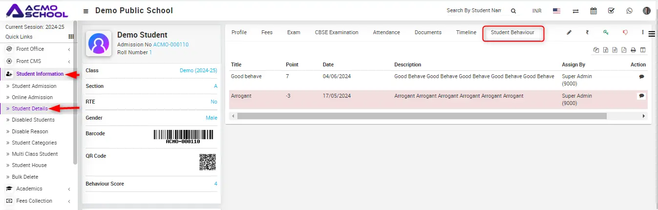 Here Student can see the behaviour report details.