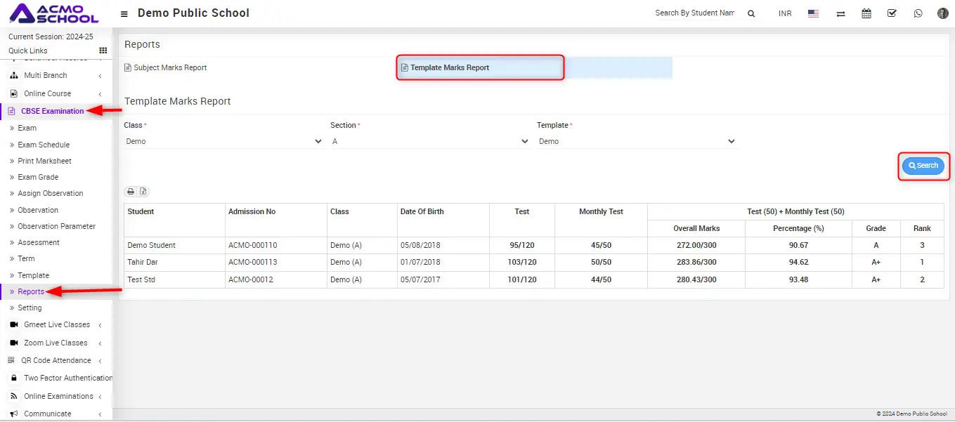 Here you can see Subject Marks Report available.