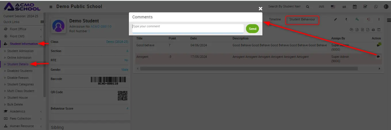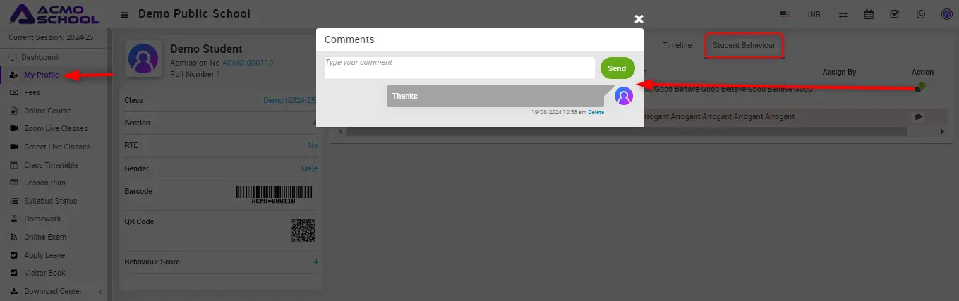 Now, write the comment related to the incident and click on the send button, which is showing on the right side, and the comment will be sent to the student / parent and comment will shown on comment box.