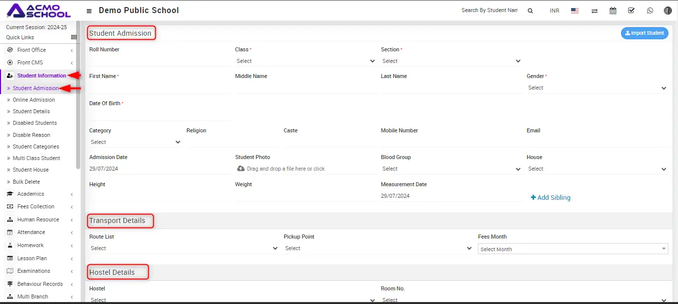 Go to Student Information > Student Admission then Add Student admission details, Transport details, Hostel Details, Fees Details, Parent Guardian Details.