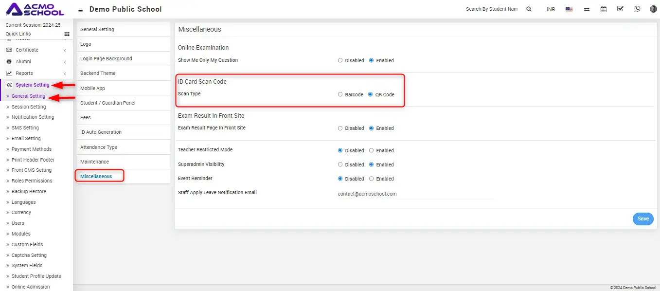 To add the Barcode/QR-code in the staff/admin ID card , go to System Settings > General Settings > Miscellaneous.