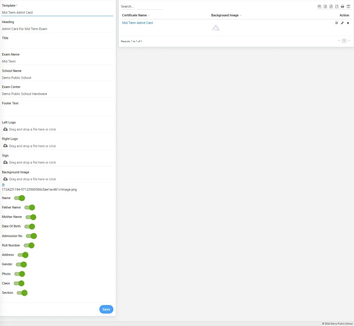 Go to Examination > Design Admit Card then enter the field details and then click on Save button.
