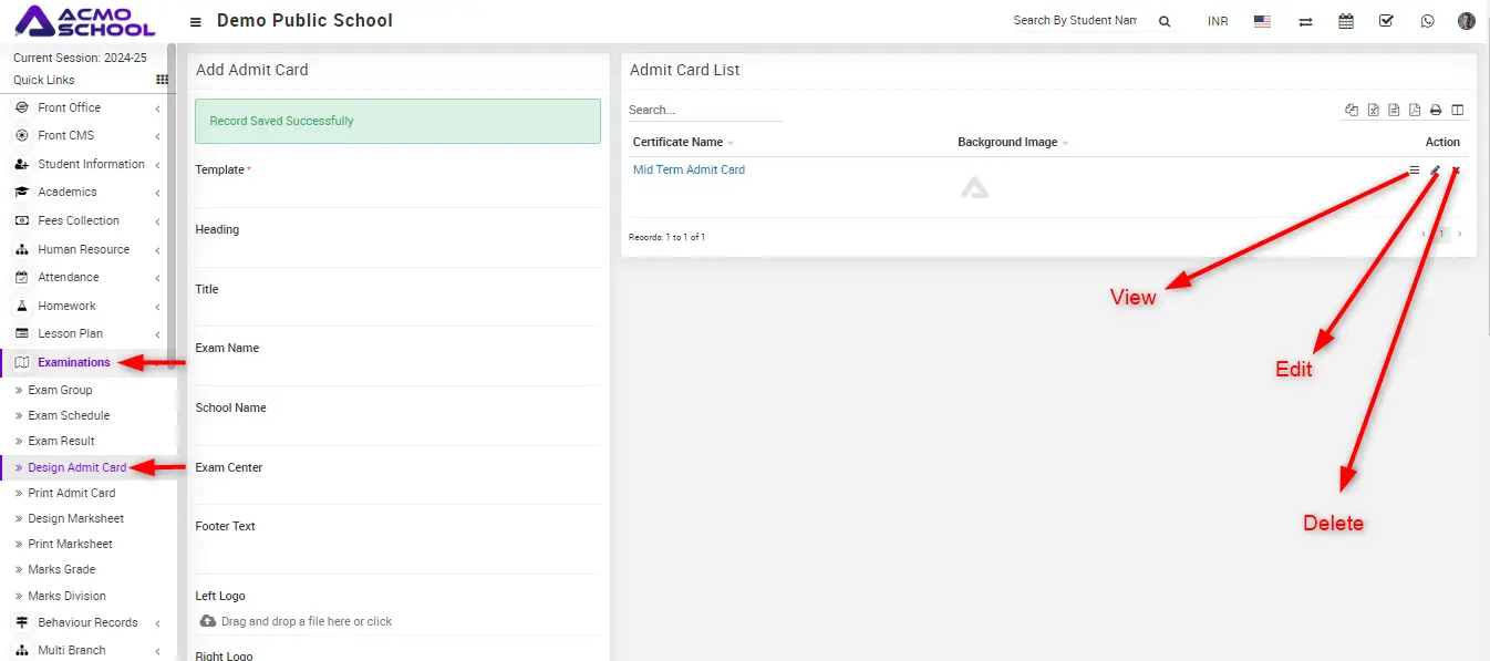 To edit admit card click on Edit icon and to delete admit card click on Delete icon present in admit card list.