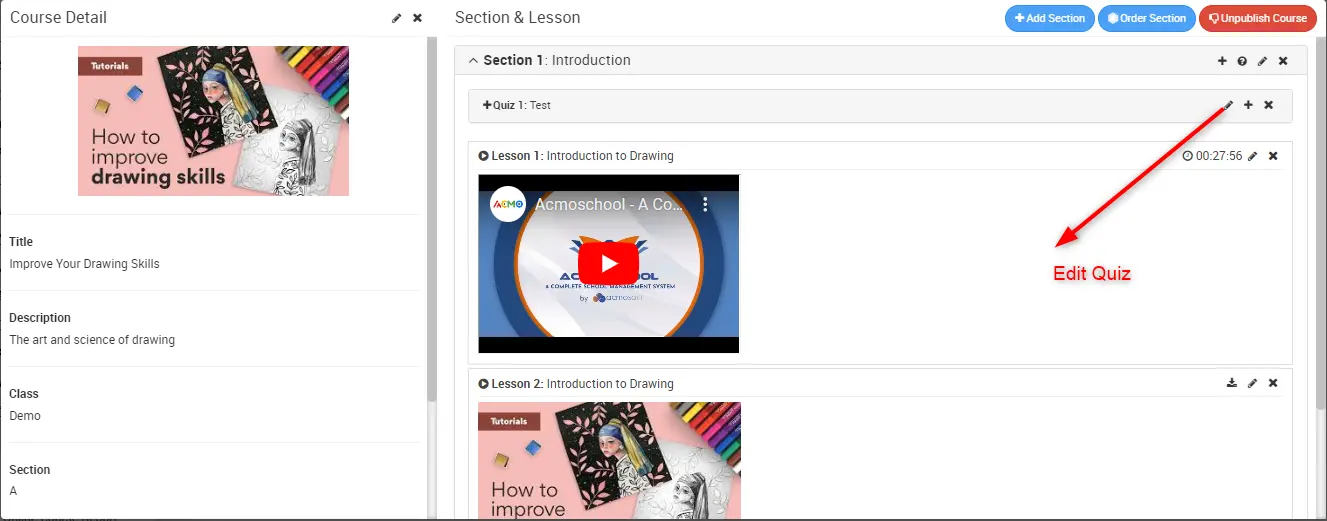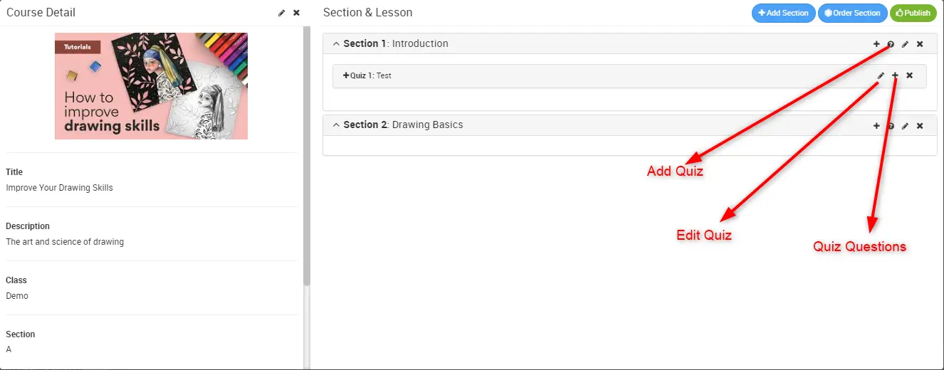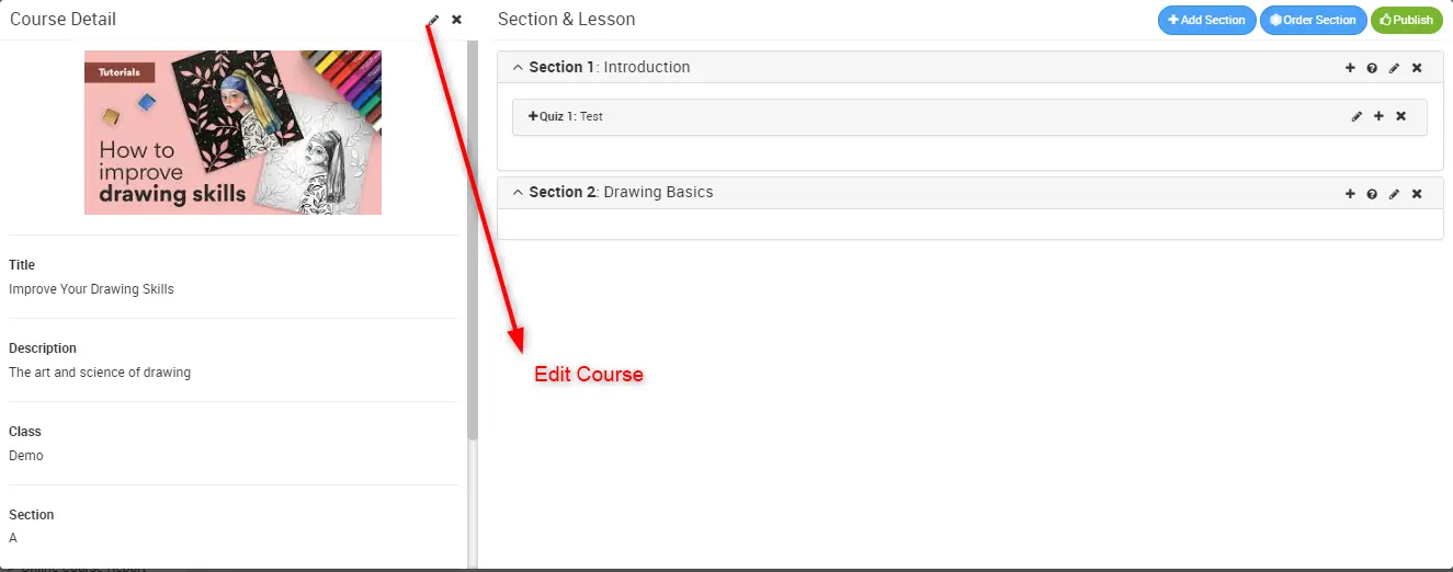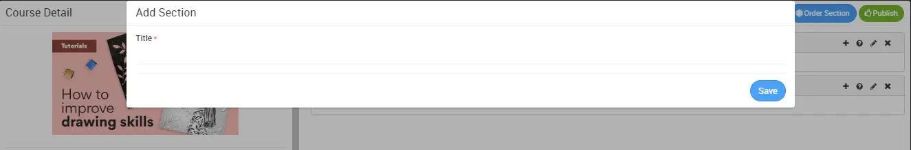 Once course is created course detail modal will open, here you will see three option Add Section, Order Section and Publish Course.
