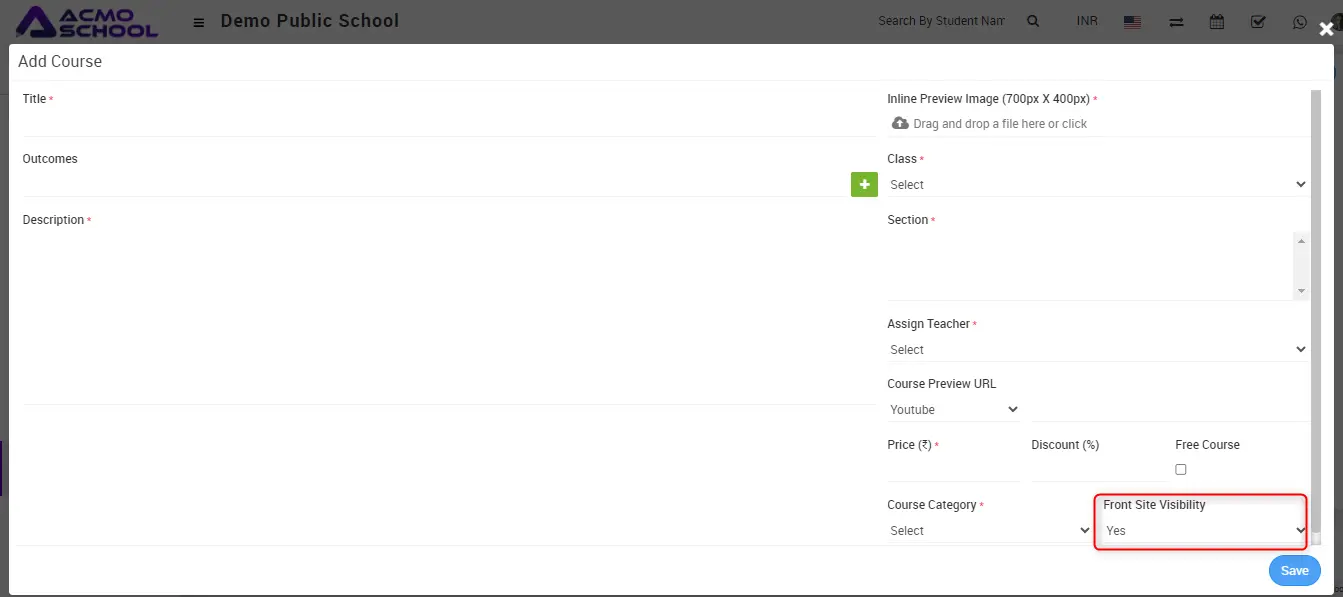 Select Front Site Visibilty “Yes”, the online course, which you added, will be shown in front side of school software, and if you select No, online course will not be visible in front side of school software.