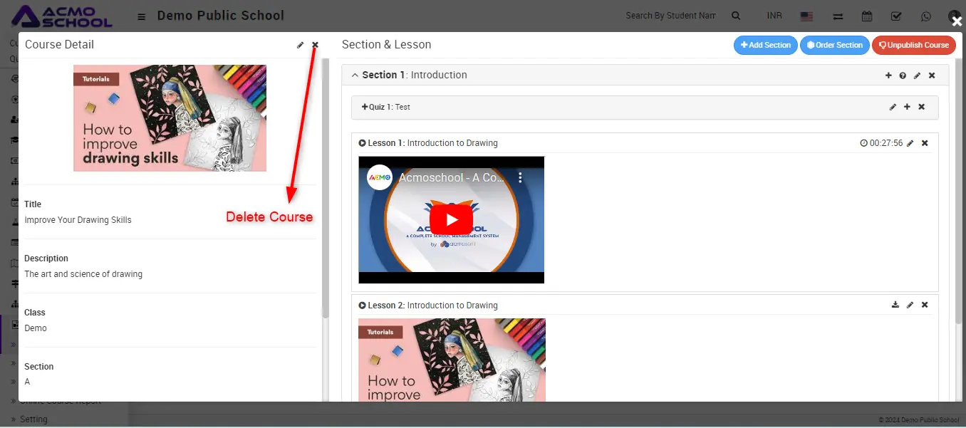 To delete the course, click on the Delete icon present at the top left side of the Course Details modal.