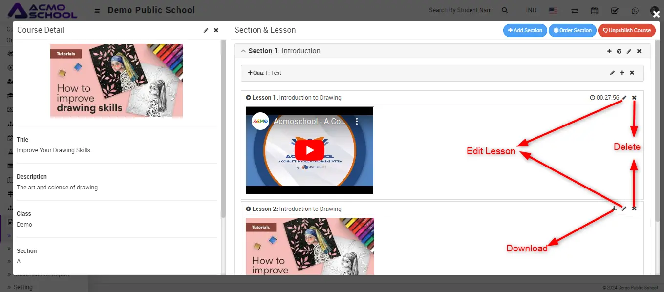 Note – If you delete any course then related section and lesson and quiz will also be deleted.