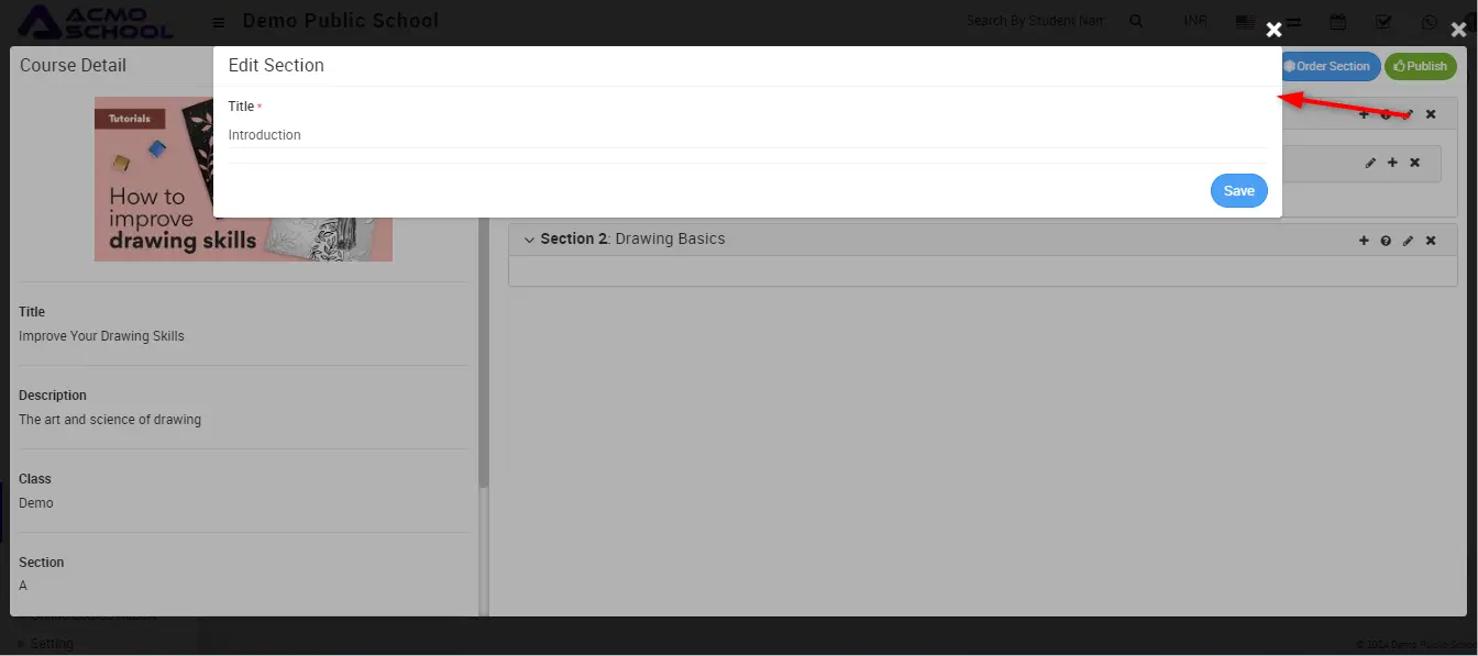 To edit section click on the Edit icon present in the front of section title, at the click of this edit icon an edit modal will open, here edit the section Title and click to Save button.