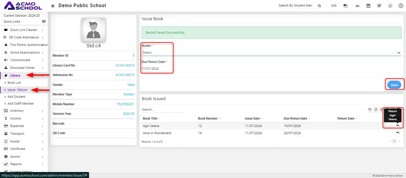 Here search the student by entering Member Id, Library Card No or Admission No.