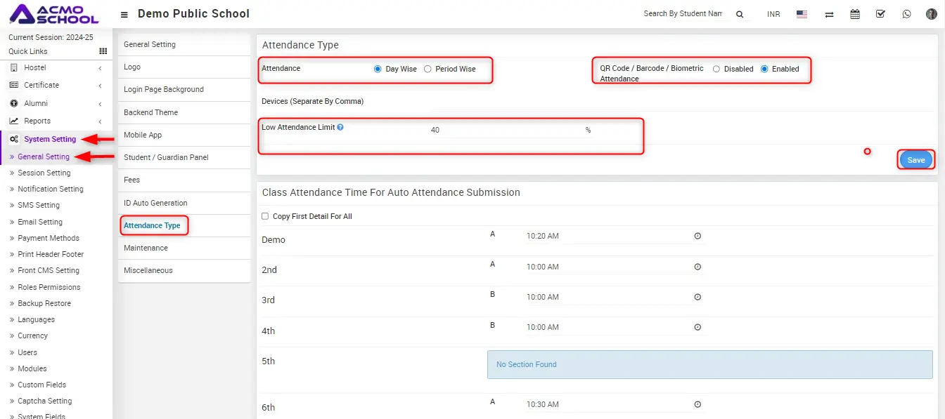 Here select the any one attendance type Day Wise or Period Wise.