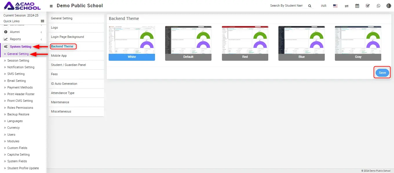 Here you can see the multiple theme option available as White, Default, Red, Blue and Gary theme, choose one of them then click on save button.