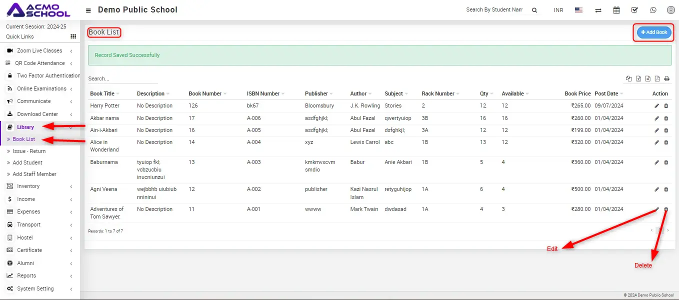 To edit book click on the Edit icon present in the book list and to delete the book click on the Delete icon present in the book list.