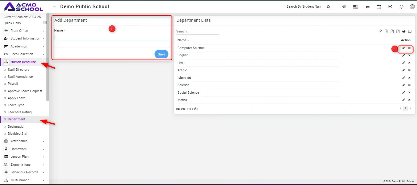 How to manage Departments? Go to Human Resource > Departments Here you can Add/Edit/Delete Departments 1. To Add Department enter Name and then click on Save button. 2. To edit/delete department click on Edit/Delete icon present at Action column in the Department list. Updated on June 24, 2024 Tagged: AdminHR ManagementManage DepartmentsPrincipal Was this article helpful? Yes No Related Articles How to check Payroll Report? How to view Disabled Staff? How to view Teachers rating? How to Approve Leave Requests? How to Apply for a Leave? How to generate Payroll for Staff members?