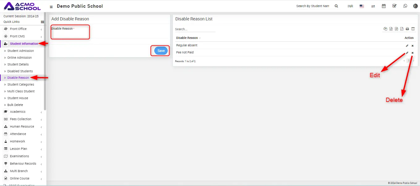 To edit disable reason click on the Edit icon and to delete disable reason click on the Delete icon present in the disable list.