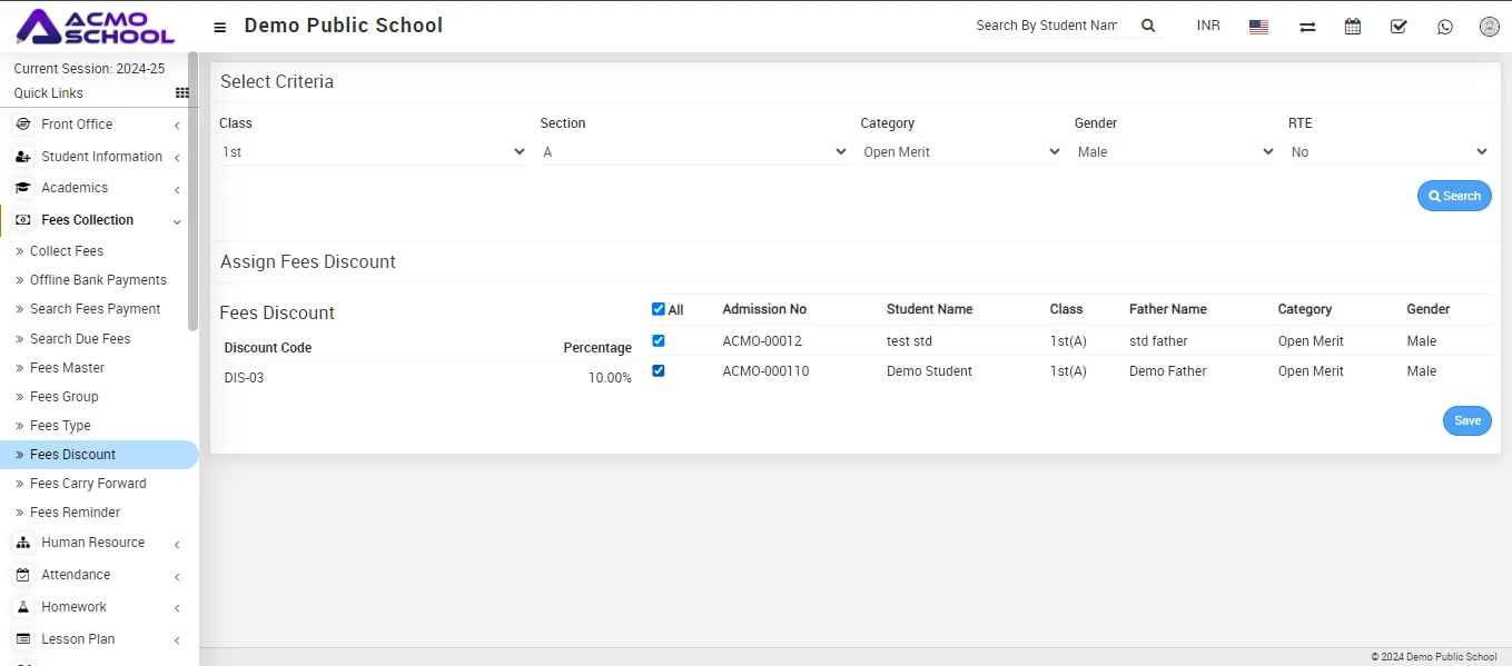 The student list will be displayed, and you can select the student to whom you want to assign the fee discount by checking the box, then click the Save button to assign the discount to the students.